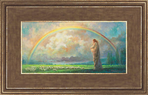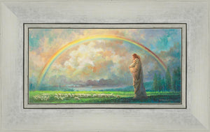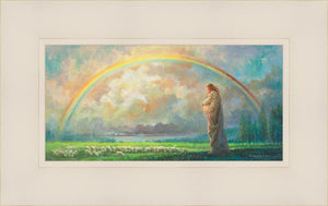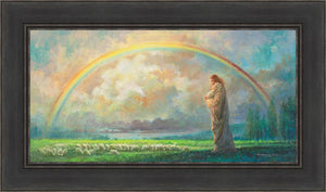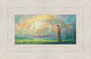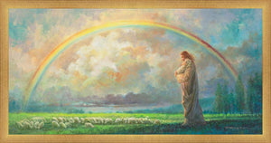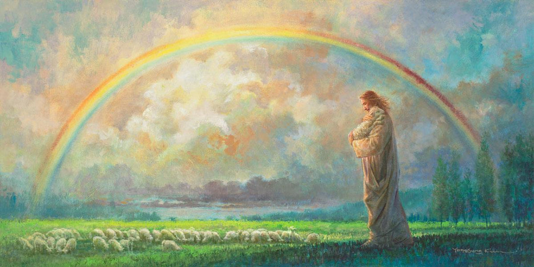 After the Storm is a painting by Yongsung Kim. This painting depicts Jesus Christ looking at a rainbow while holding a little lamb.