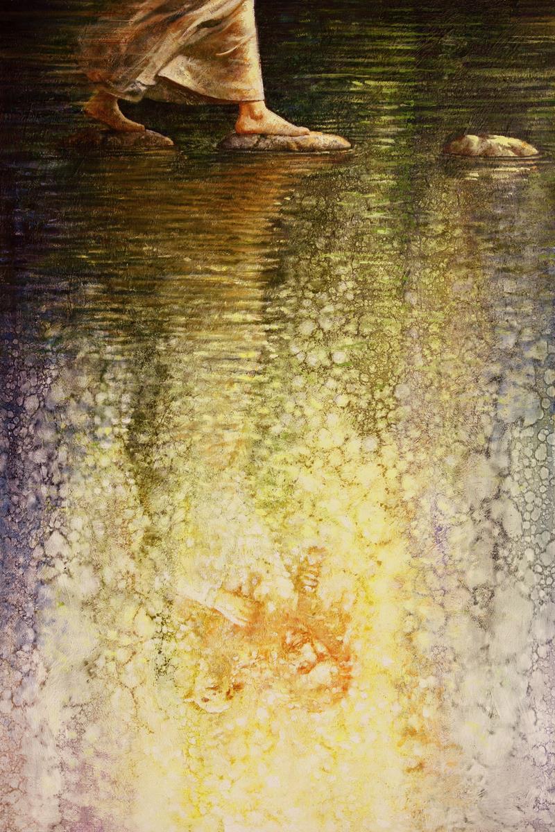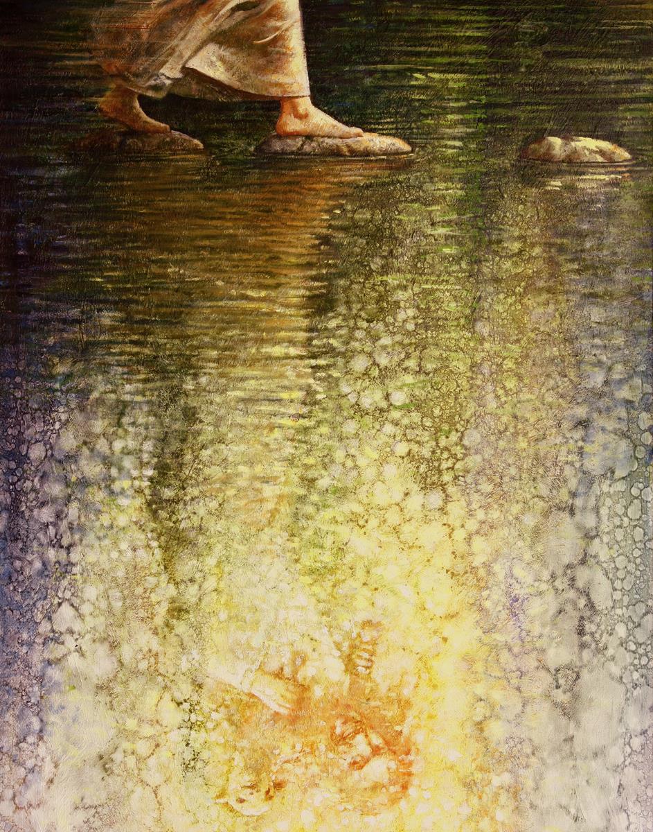 Faith by Yongsung Kim depicts the feet of Jesus walking on stones across a river. In the reflection of the water you see Jesus' face and a lamb on His shoulders. This painting is available in print and canvas.