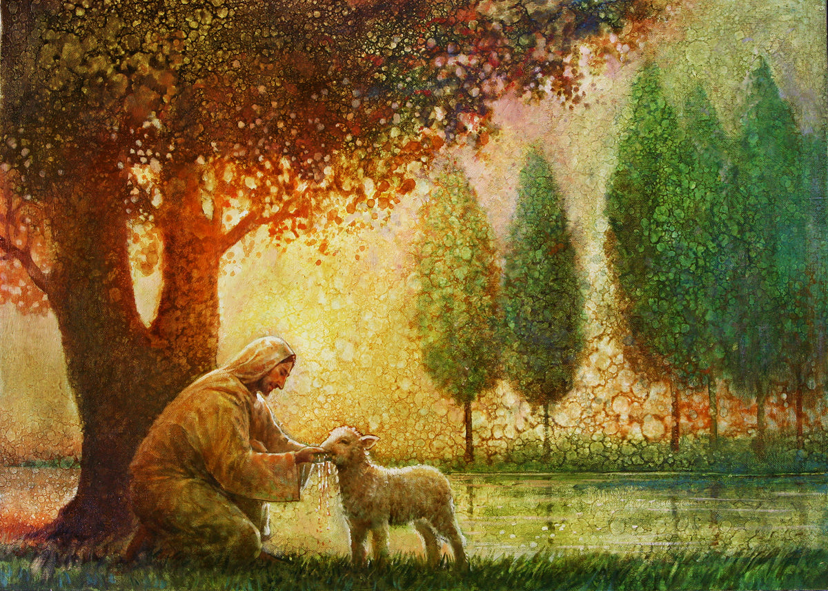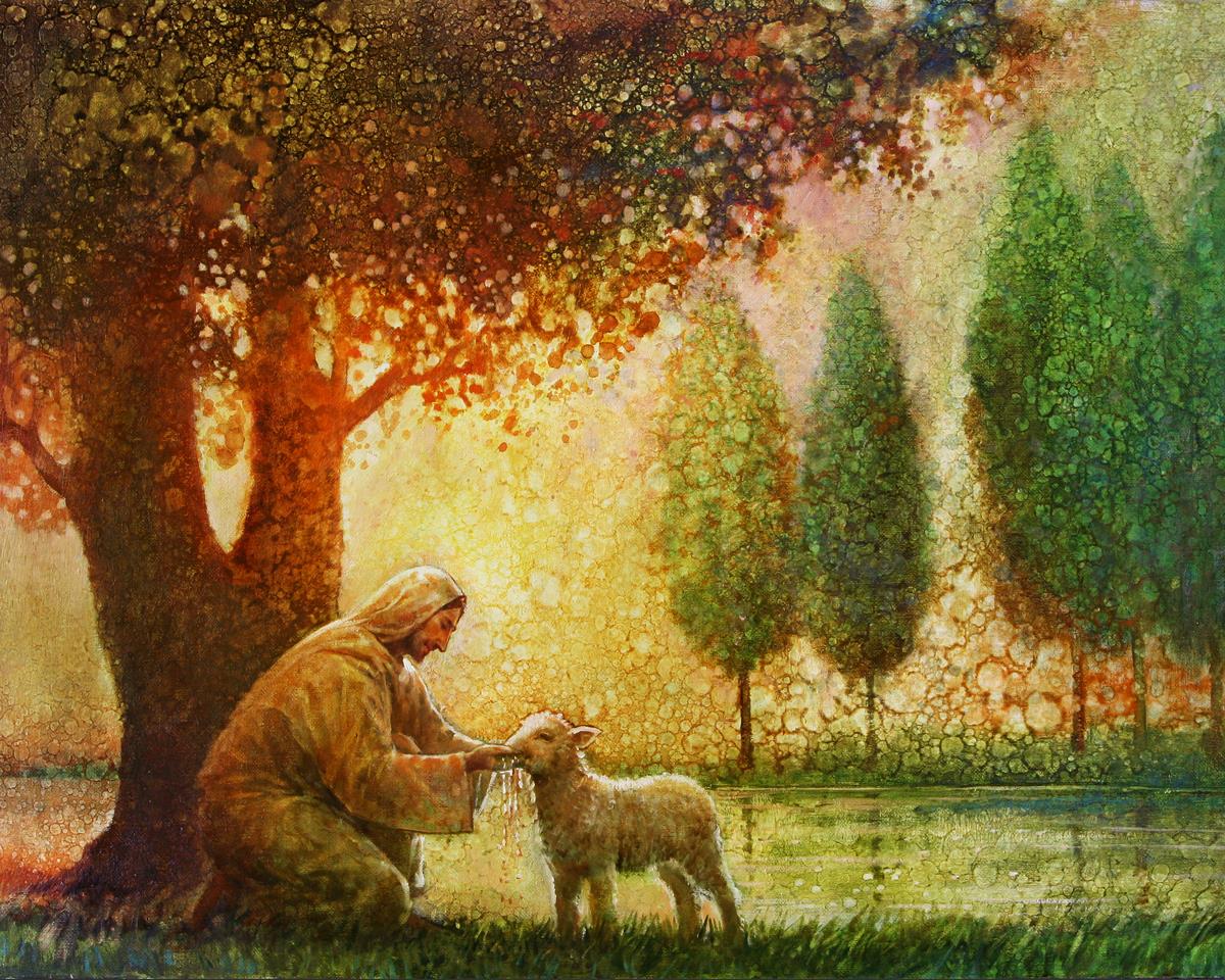 Living Water by Yongsung Kim depicts Jesus kneeling under a large red tree feeding a sheep near a pond with tall green trees on the other side. This painting is available in print and canvas.