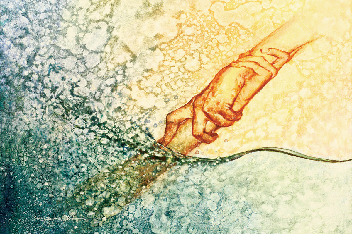 The Rescuer by Yongsung Kim depicts the hand of Jesus reaching down and grabbing the hand of Peter to pull him out of the sae. This painting is available in print and canvas.